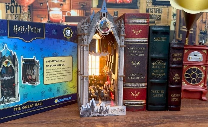 Från elever samlade vid husets bord till de stora ljuskronorna och glasmålningarna, fångar denna bokhörna essensen av Hogwarts i miniatyrform.