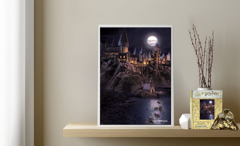 Med hjälp av banbrytande UV-trycktekniker fångar detta pussel båtarnas månbelysta resa till Hogwarts med slående detaljer och färg för en imponerande visning när den är klar.