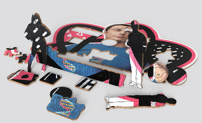 Fira seriens briljans med unikt formade pusselbitar som Sheldon, Penny, DNA-strängar, den ikoniska soffan, vetenskapliga element, Bazinga pratbubblor och mycket mer.