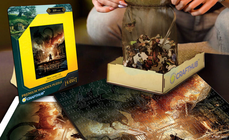 Ge dig ut på en episk resa genom Midgård med pusselbitar formade som Bilbo, Gandalf, Gollum, draken Smaug, Ringen och legendariska symboler från The Hobbit.