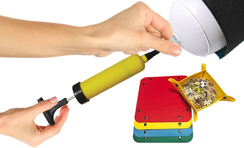 En minihandpump för uppblåsning av tuben medföljer. Dessutom medföljer fyra sorteringsbrickor i färgad filt. Dessa vikbara brickor hjälper dig att organisera pusselbitarna efter färg eller form, vilket gör det enklare och effektivare att lösa dina pussel.