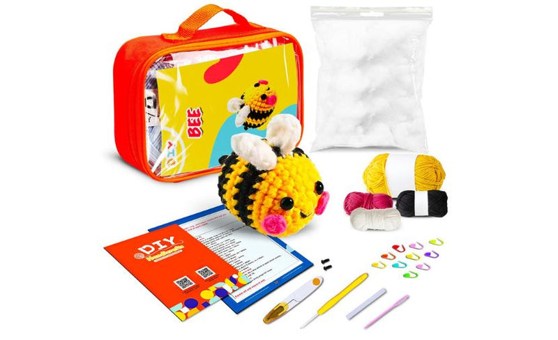 Allt-i-ett virkpaket innehÄller: en virknÄl med dubbla spetsar, maskmarkörer, en trubbig nÄl för att fÀsta ögonen, pysselögon, mjukt fyllnadsmaterial, olika garn, en omfattande guidebok och en praktisk bÀrvÀska för hela setet.