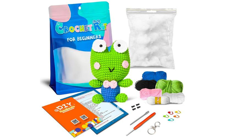 Allt-i-ett virkpaket innehåller: en virknål med dubbla spetsar, maskmarkörer, en trubbig nål för att fästa ögonen, pysselögon, mjukt fyllnadsmaterial, olika garn, en omfattande guidebok och en praktisk bärväska för hela setet.