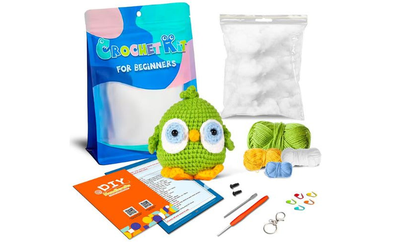 Allt-i-ett virkpaket innehåller: en virknål med dubbla spetsar, maskmarkörer, en trubbig nål för att fästa ögonen, pysselögon, mjukt fyllnadsmaterial, olika garn, en omfattande guidebok och en praktisk bärväska för hela setet.