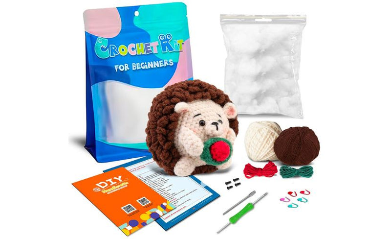 Allt-i-ett virkpaket innehÄller: en virknÄl med dubbla spetsar, maskmarkörer, en trubbig nÄl för att fÀsta ögonen, pysselögon, mjukt fyllnadsmaterial, olika garn, en omfattande guidebok och en praktisk bÀrvÀska för hela setet.