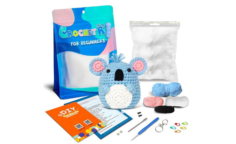 Allt-i-ett virkpaket innehÄller: en virknÄl med dubbla spetsar, maskmarkörer, en trubbig nÄl för att fÀsta ögonen, pysselögon, mjukt fyllnadsmaterial, olika garn, en omfattande guidebok och en praktisk bÀrvÀska för hela setet.