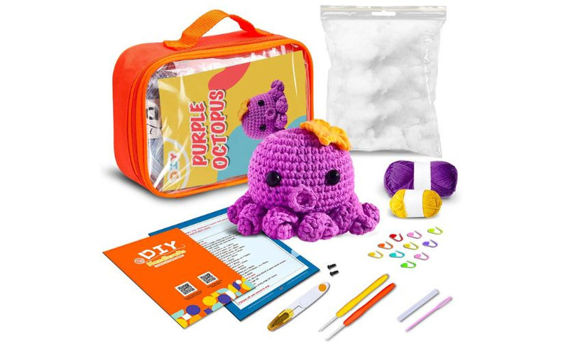 Allt-i-ett virkpaket innehåller: en virknål med dubbla spetsar, maskmarkörer, en trubbig nål för att fästa ögonen, pysselögon, mjukt fyllnadsmaterial, olika garn, en omfattande guidebok och en praktisk bärväska för hela setet.