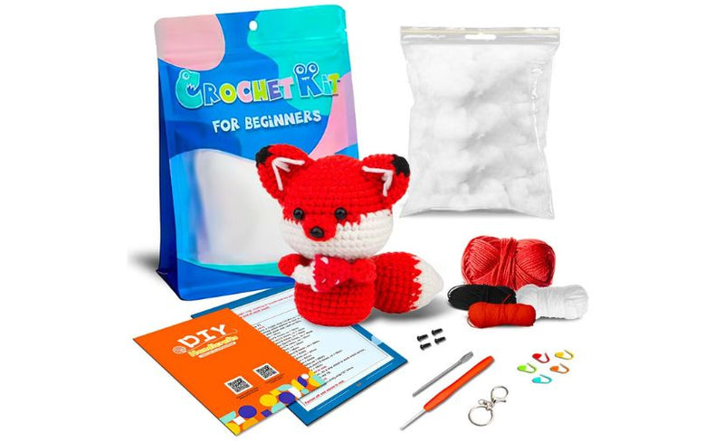 Allt-i-ett virkpaket innehåller: en virknål med dubbla spetsar, maskmarkörer, en trubbig nål för att fästa ögonen, pysselögon, mjukt fyllnadsmaterial, olika garn, en omfattande guidebok och en praktisk bärväska för hela setet.