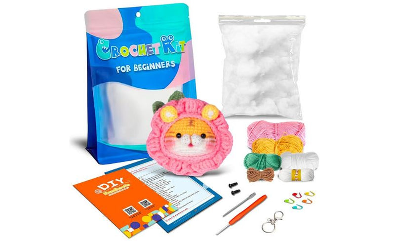 Allt-i-ett virkpaket innehåller: en virknål med dubbla spetsar, maskmarkörer, en trubbig nål för att fästa ögonen, pysselögon, mjukt fyllnadsmaterial, olika garn, en omfattande guidebok och en praktisk bärväska för hela setet.