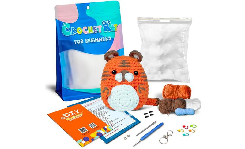 Allt-i-ett virkpaket innehÄller: en virknÄl med dubbla spetsar, maskmarkörer, en trubbig nÄl för att fÀsta ögonen, pysselögon, mjukt fyllnadsmaterial, olika garn, en omfattande guidebok och en praktisk bÀrvÀska för hela setet.