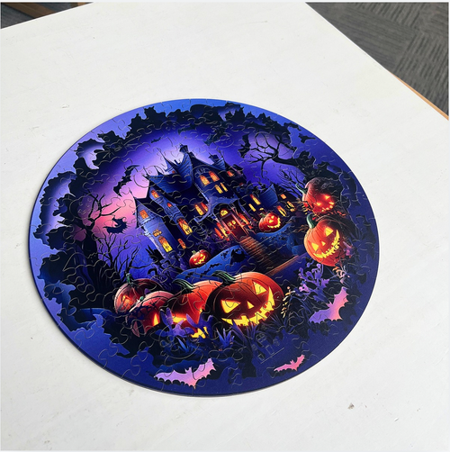 När du sätter ihop det här pusslet med spöklikt tema kommer du att upptäcka nyckfulla former som fångar den kusliga charmen med Halloween, inklusive kusliga spöken, pumpor, gravstenar och mer.