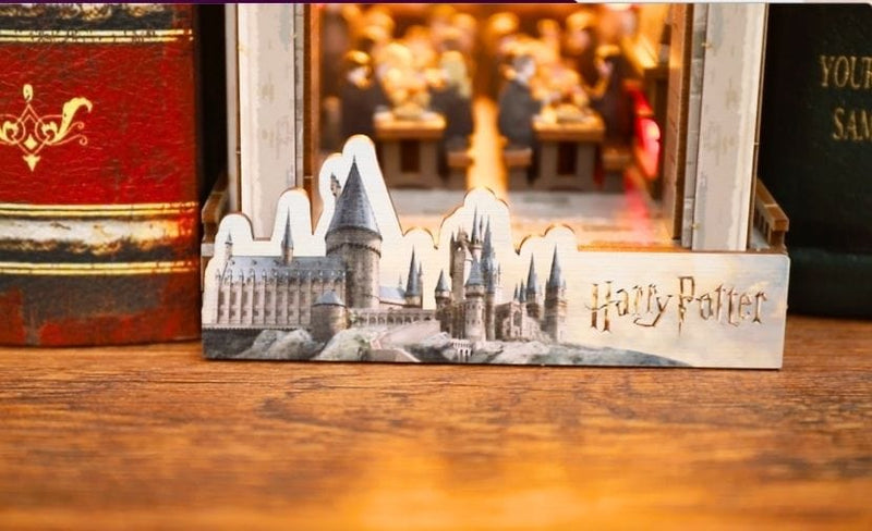 Vackert snidad i träbasen välkomnar den ikoniska Hogwarts-silhuetten dig innan du ens kliver in. Med sina spiror och torn som leder in i den glödande Stora salen skapar denna lilla detalj den perfekta scenen för magin som utspelar sig därinne.